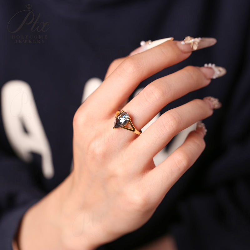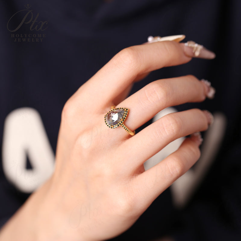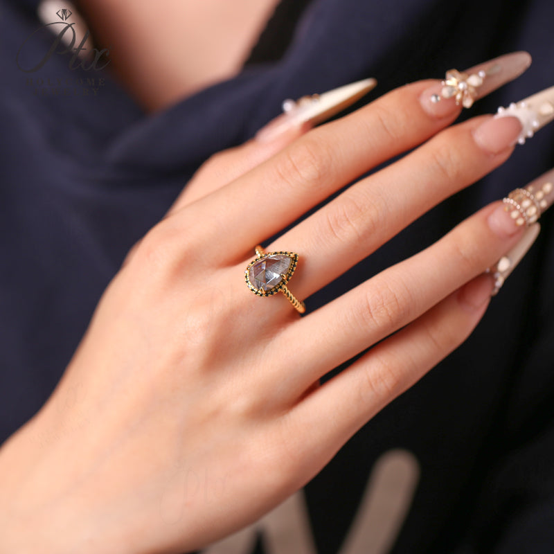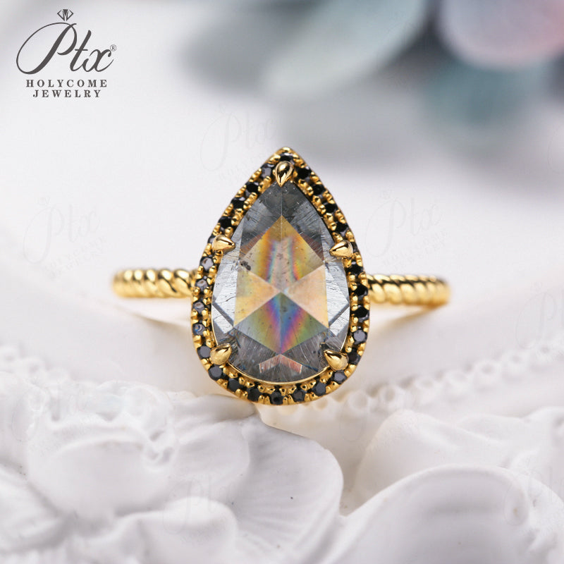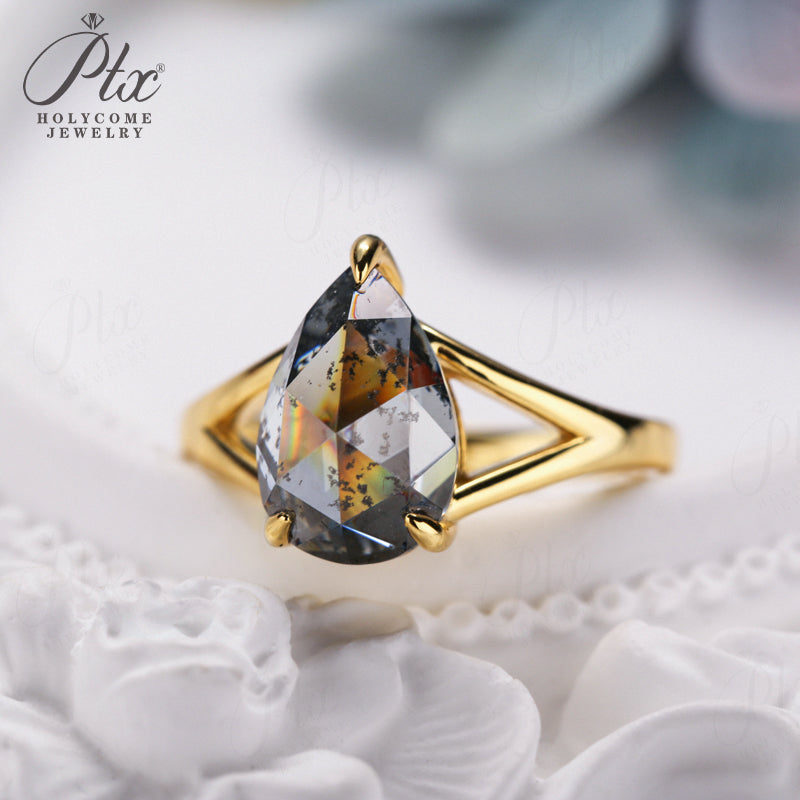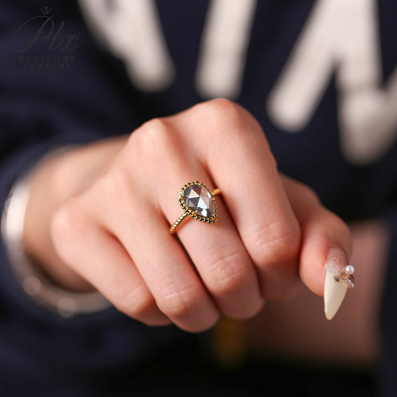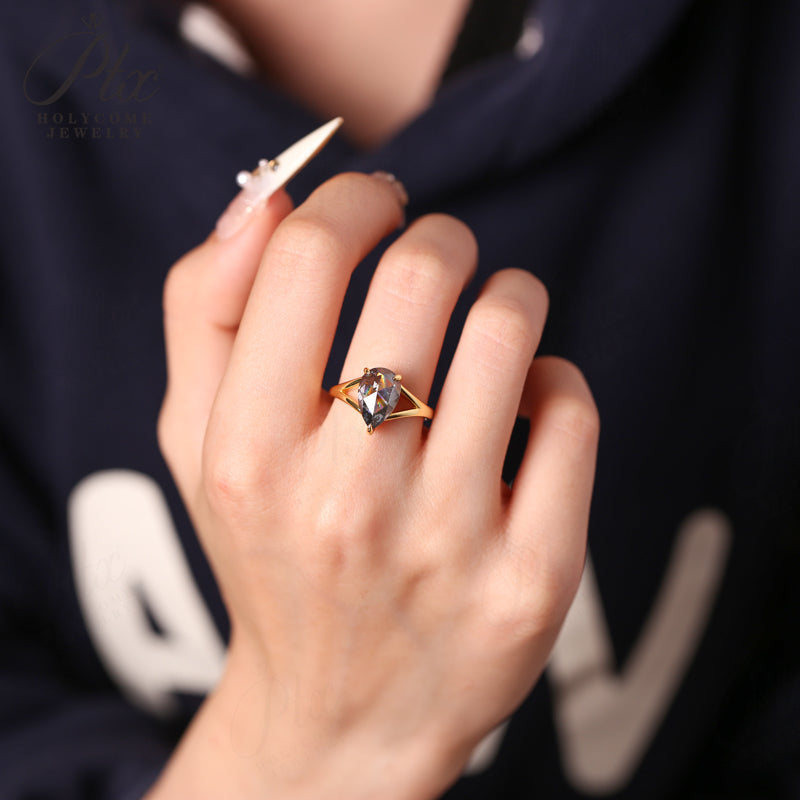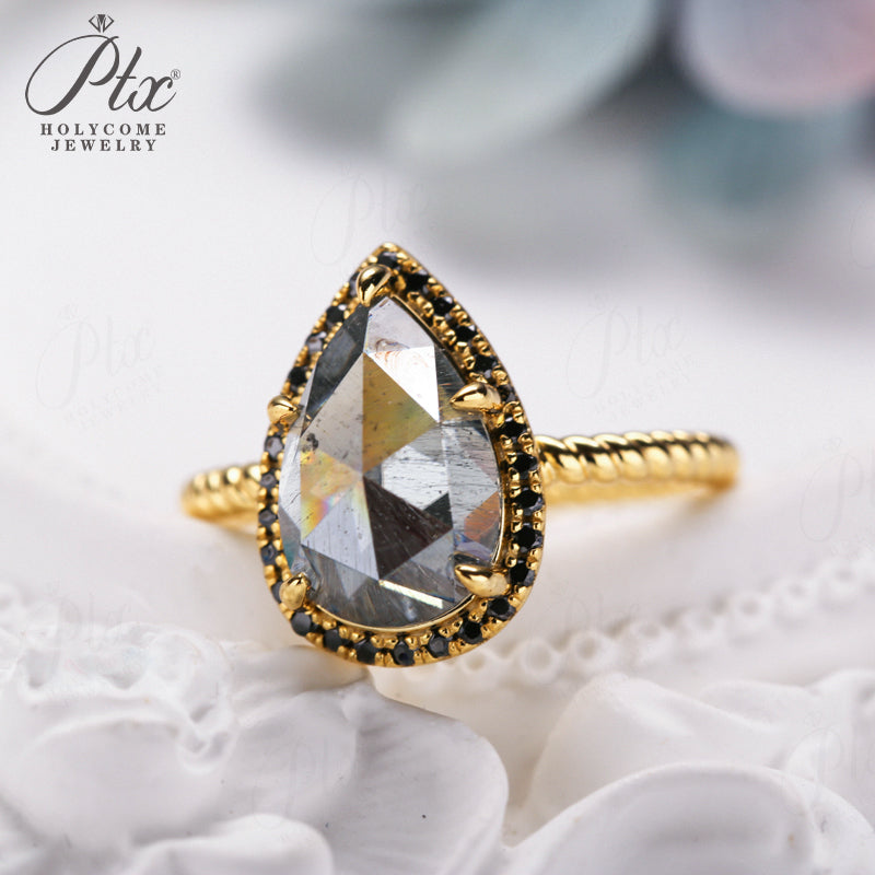 Engagement Ring Salt and Pepper Moissanite Diamond Pear Cut 925 Sterling Silver Plated with 18k Gold Wedding Jewelry Vintage