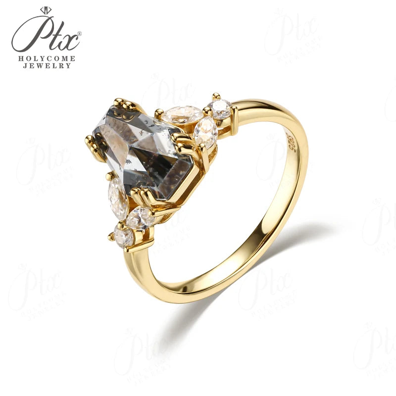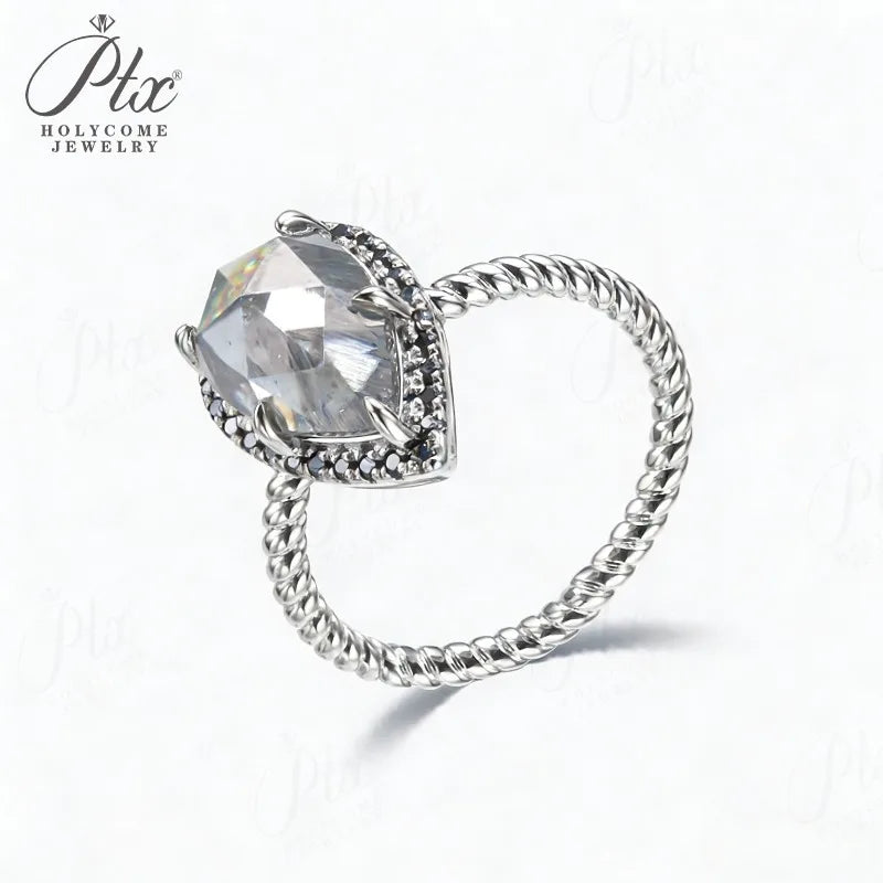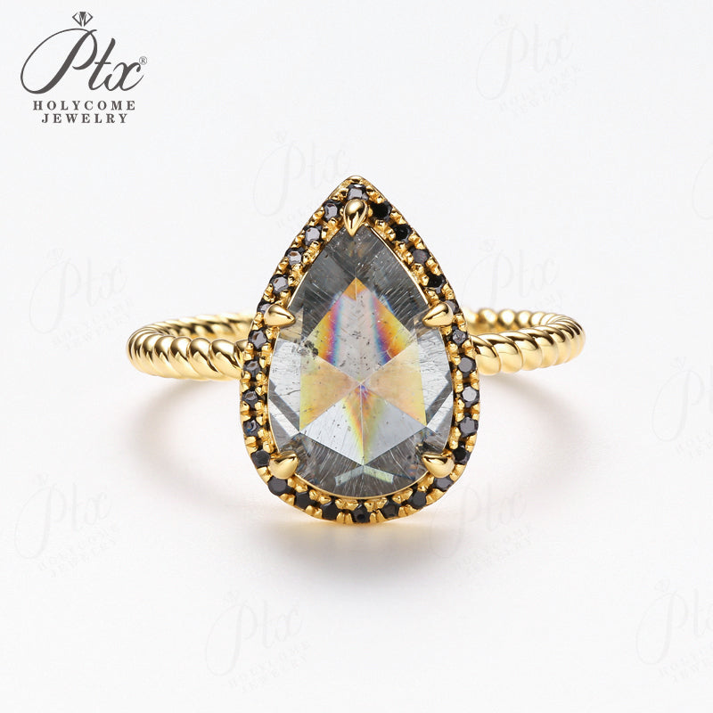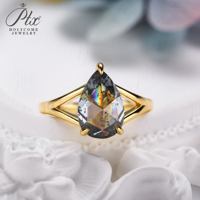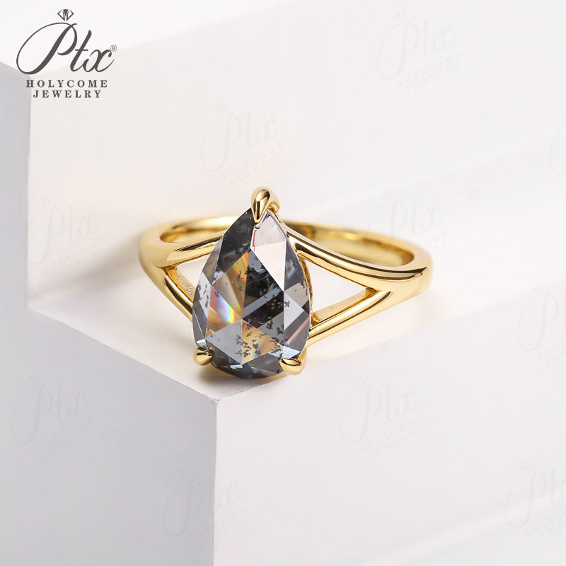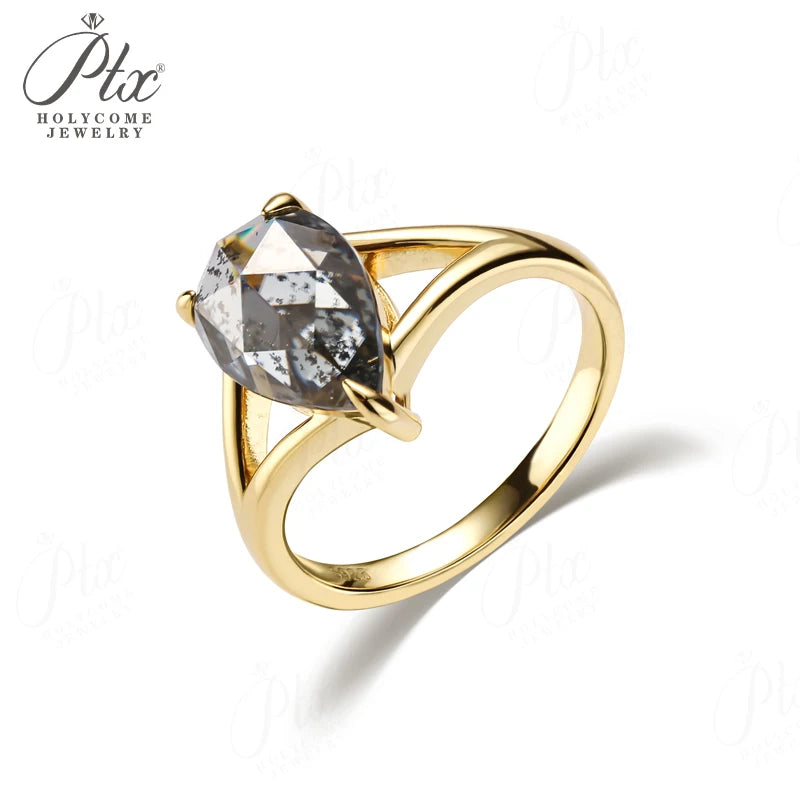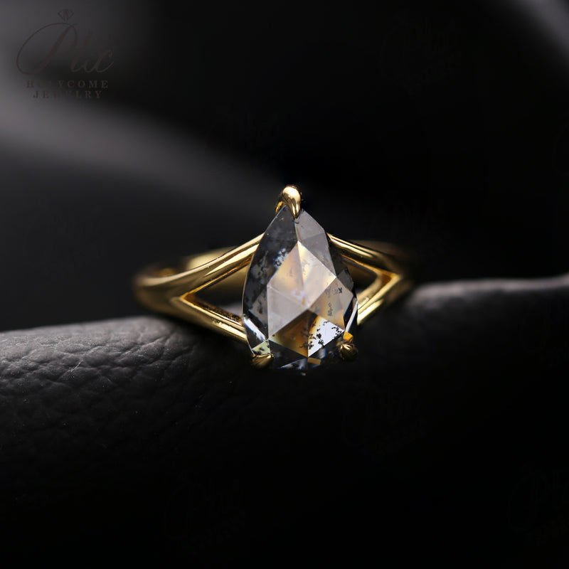 Engagement Ring Salt and Pepper Moissanite Diamond Pear Cut 925 Sterling Silver Plated with 18k Gold Wedding Jewelry Vintage